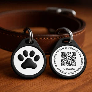 Légère, discrète et résistante, la médaille se fixe simplement au collier ou au harnais et ne nécessite aucune application pour la personne qui scanne.